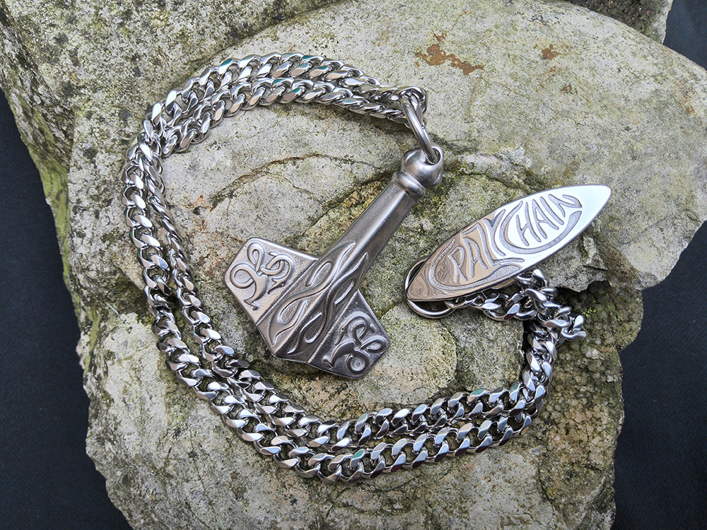 Der Thorshammer, einst Mjölnir genannt, verkörpert die mächtige und magische Waffe des Gottes Thor. Der von Zwergen geschmiedete Hammer verfehlte nie sein Ziel und kehrte nachdem er gegen Feinde geschleudert wurde stets in die Hand Thors zurück. Der Thorshammer galt als kraftvolles Schutz- und Idenditätssymbol der nordischen Kultur. 60 Millimeter lang und 42 Millimeter breit. Gewicht 52 Gramm