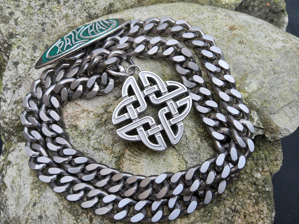 Das sogenannte Flechtbandmuster erfreute sich vom 7. bis zum 9. Jahrhundert n. Chr. großer Beliebtheit. Für die keltischen Nachfahren in Irland, aber auch die seefahrenden Völker jener Zeit versinnbildlichte das Symbol Ewigkeit und Unvergänglichkeit. Darüber hinaus steht dieses Amulett auch für den ewigen Kreislauf der Natur, Leben, Tod, und Wiedergeburt. 42 Millimeter hoch und 37 Millimeter breit, sowie 10 Millimeter dick. Gewicht 48 Gramm